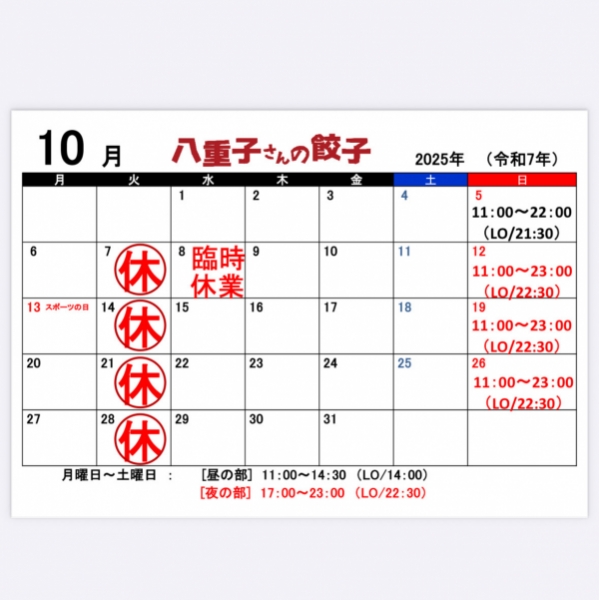 【2025年10月営業カレンダー】[営業時間]カレンダー通りで営業いたします。[臨時休業]10月8日(水曜...